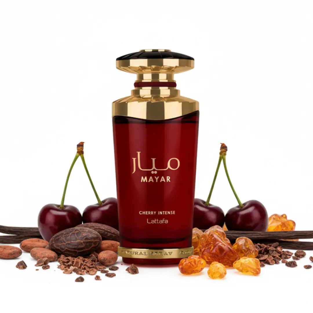 Mayar Cherry Intense ist ein richtig süßer und üppiger Duft. Er mischt frische Früchte mit leckeren Gourmand-Noten und einem cremigen, warmen Ende. Am Anfang riecht er frisch und fruchtig, dann wird es durch die Süße von Kirschmarmelade und Kakao intensiver. Zum Schluss kommen Vanille, Amber und Patchouli durch, die dem Duft Wärme und Tiefe geben. Das macht ihn super gemütlich und edel. Perfekt für kühle Tage oder den Abend, wenn du süße, fruchtige und gourmandige Düfte mit einem Hauch von Klasse magst.