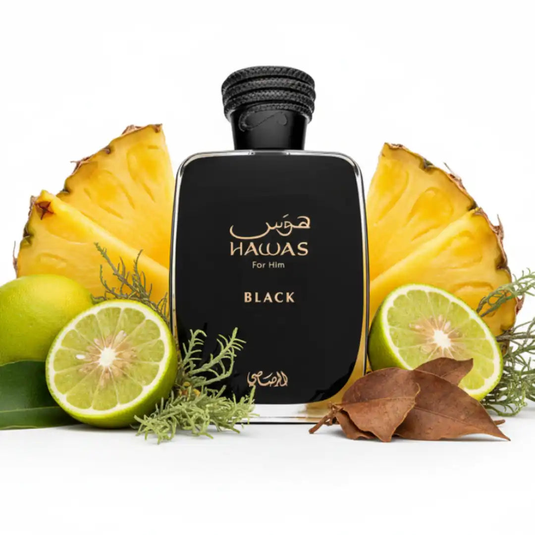 Hawas Black de Rasasi huele genial porque mezcla lo fresco de la bergamota, piña y pomelo con lo cálido y terroso del pachulí, cedro y jazmín. Esta combinación hace que el perfume sea moderno y con clase, así que va bien tanto para el día a día como para esos momentos especiales en los que quieres algo más sofisticado. Al final, el musgo de roble, las maderas y el ámbar le dan un toque sensual que se queda contigo, por lo que es perfecto si buscas un aroma que te envuelva y dure bastante.