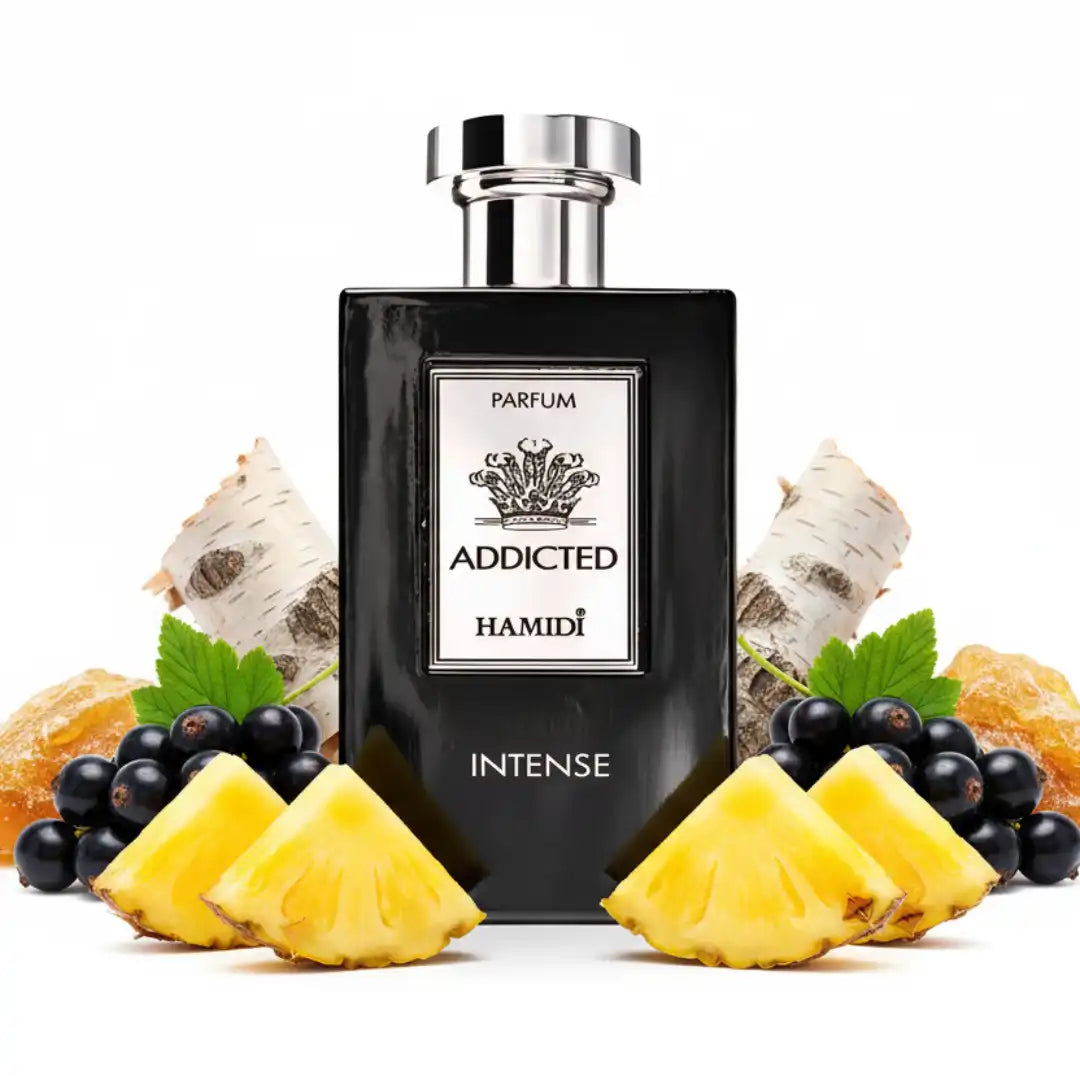 Hamidi Addicted Intense is a chypre fruity fragrance for men that showcases a vibrant and dynamic composition of fresh and fruity top notes, a floral and slightly woody heart, and a rich and earthy dry down. This fragrance features an energetic opening, a polished and slightly smoky mid-section, and a grounded and pleasant dry down that would appeal to those who enjoy lively scents with depth and sophistication.