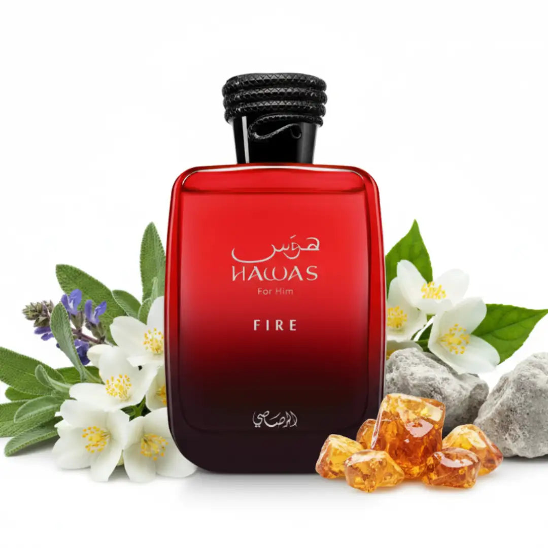 The base of Hawas Fire brings warmth and depth to the fragrance. Amber contributes a soft, resinous sweetness that softens the entire composition with an undertone of warmth. Mineral Notes contribute a slightly metallic, earthy note, grounding the fragrance and accentuating the aquatic accord. Finally, Ambergris contributes a musky, oceanic sweetness, with a refined and silky mouthfeel that lingers on the skin.