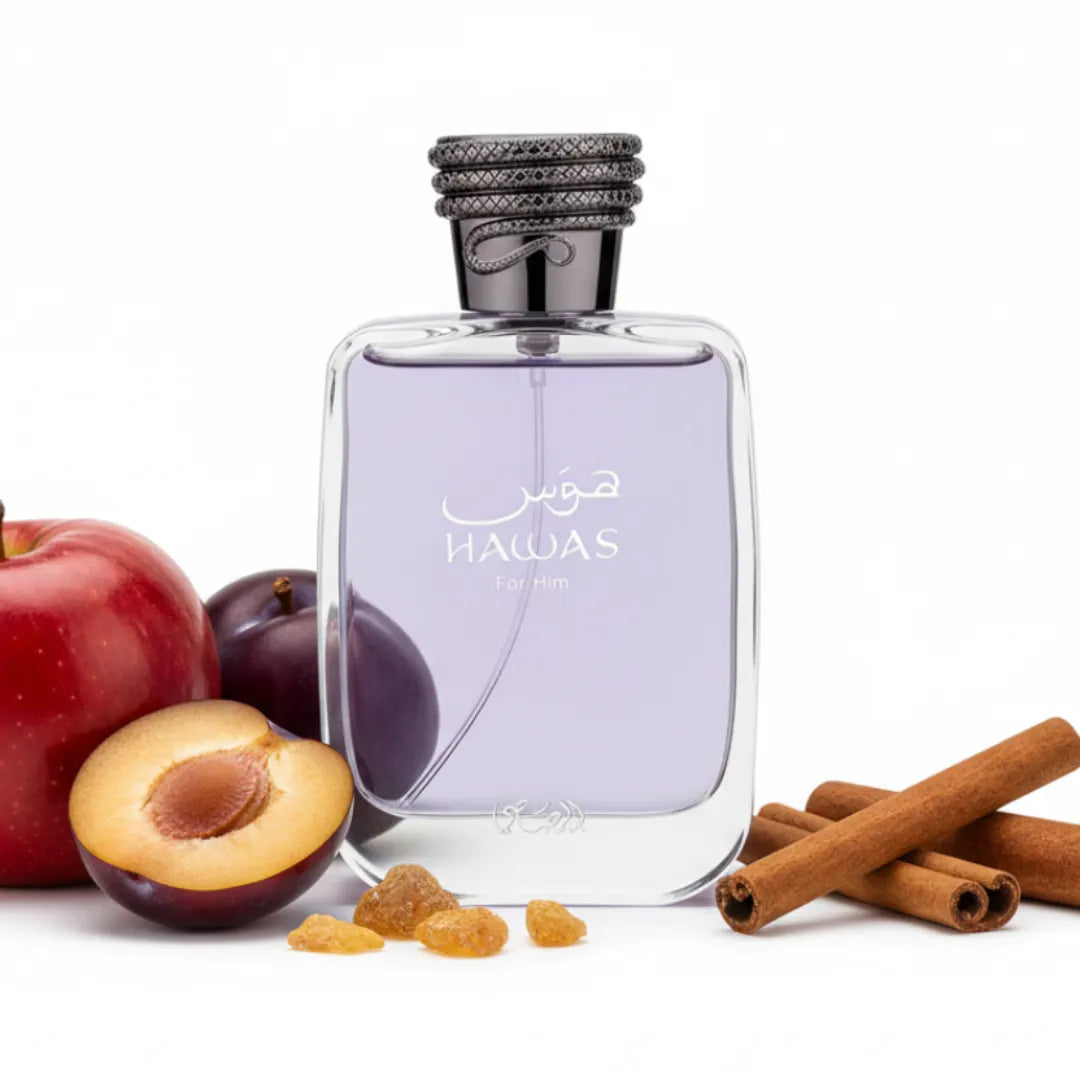 Hawas by Rasasi is a fruity, and oriental scent with a lively blend of zest, spice, and delicate florals. The top is clean and bracing from the mix of Apple, Bergamot, Lemon, and a touch of Cinnamon. Towards the dry-down, the scent becomes aquatic and revitalizing with the Watery Notes and a soft, sweet breath of Plum. The base lays the woody, musky heat with Ambergris, Musk, Patchouli, and Driftwood to make the scent invigorating and balancing.